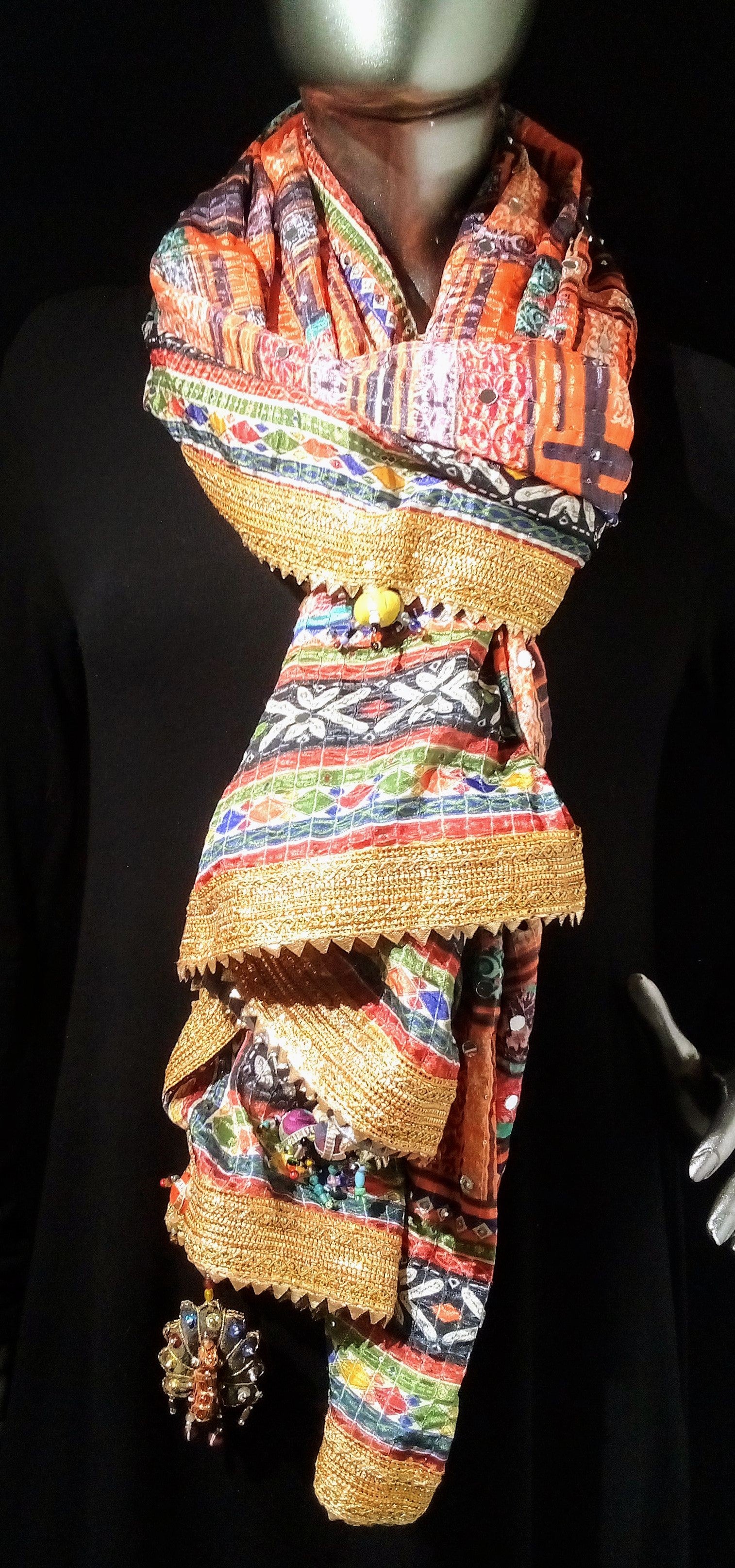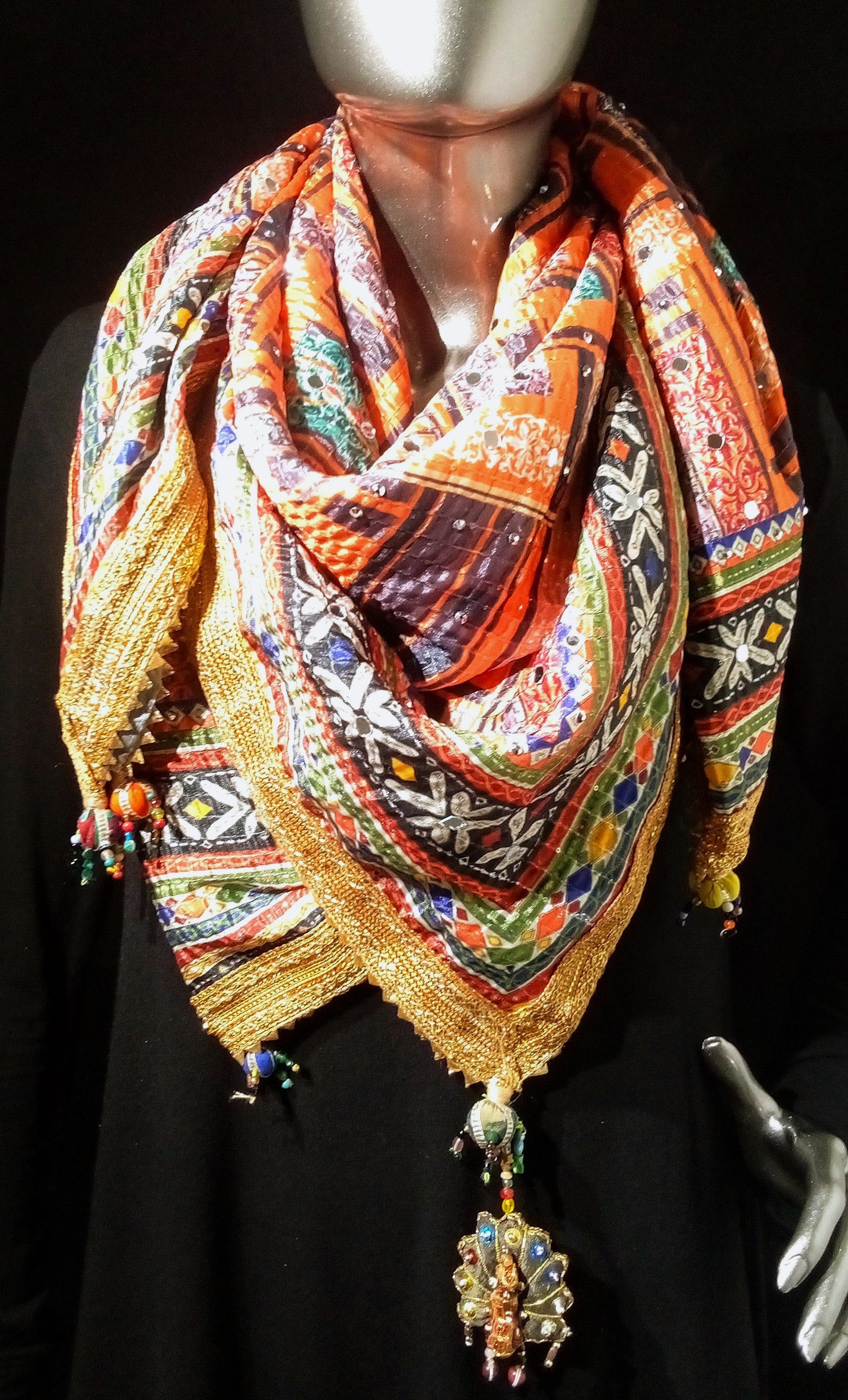 Composition : Soie imprimée, surpiqûres en coton. Bordures en lurex et fil de métal. Décorations en sequins et/ou miroirs et/ou perles. Pompons et paon en coton et perles de verre.