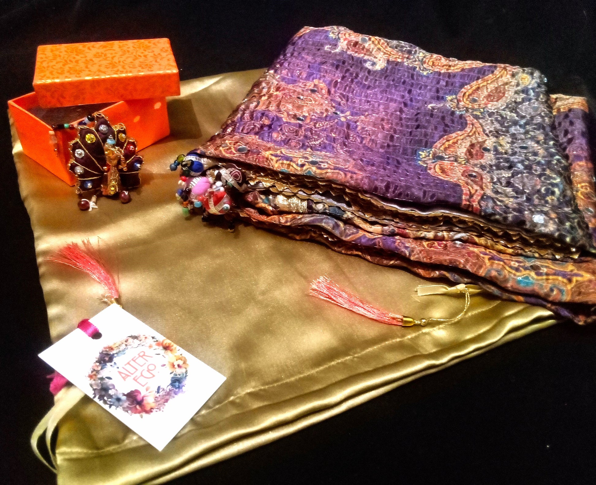 Composition : Soie imprimée, surpiqûres en coton. Bordures en lurex et fil de métal. Décorations en sequins et/ou miroirs et/ou perles. Pompons et paon en coton et perles de verre.