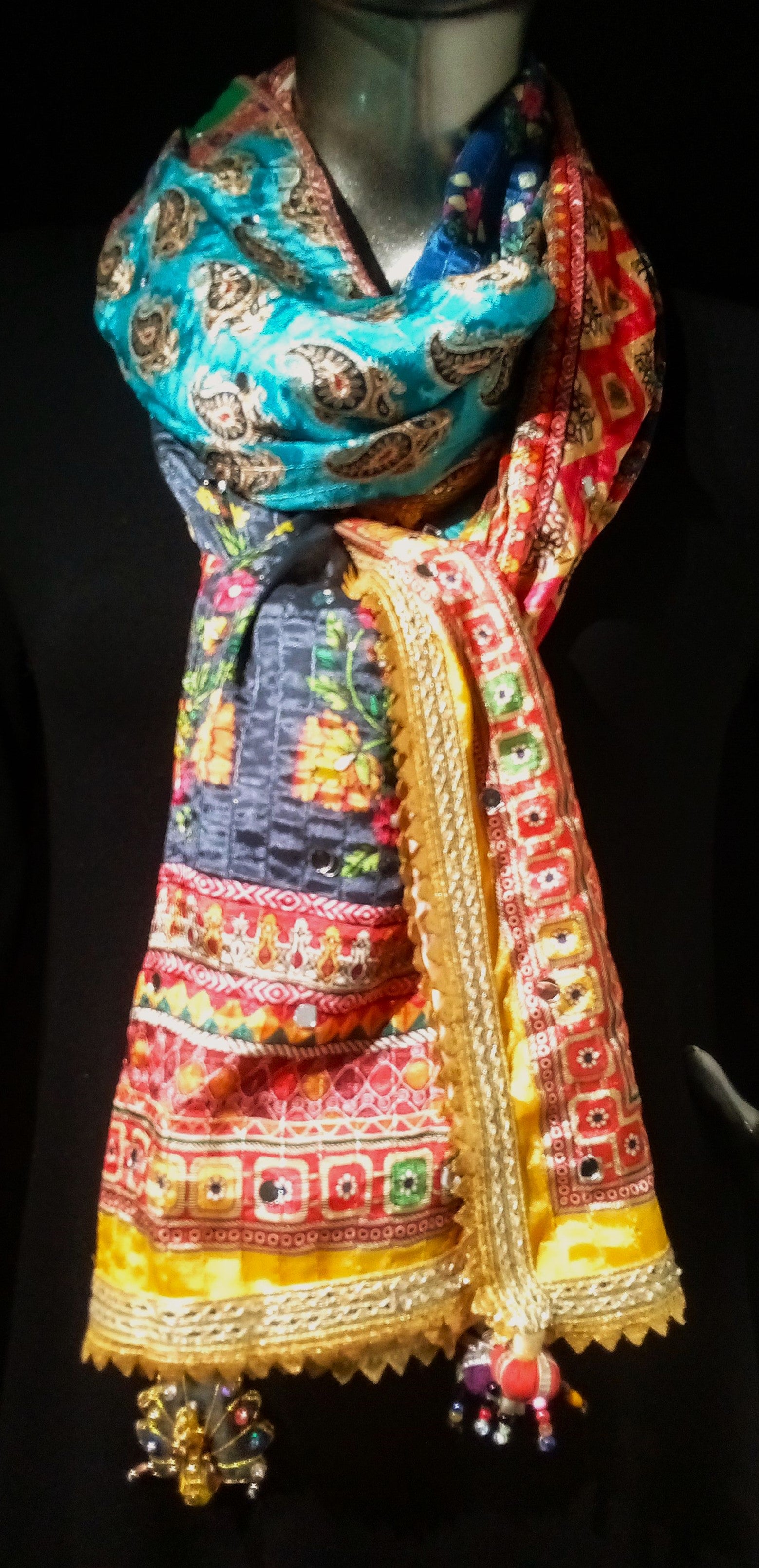 Composition : Soie imprimée, surpiqûres en coton. Bordures en lurex et fil de métal. Décorations en sequins et/ou miroirs et/ou perles. Pompons et paon en coton et perles de verre.
