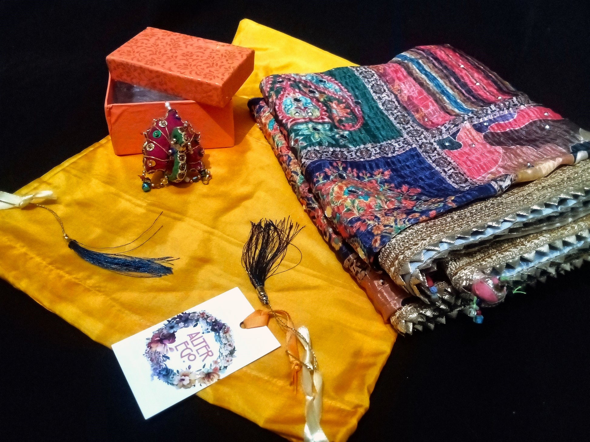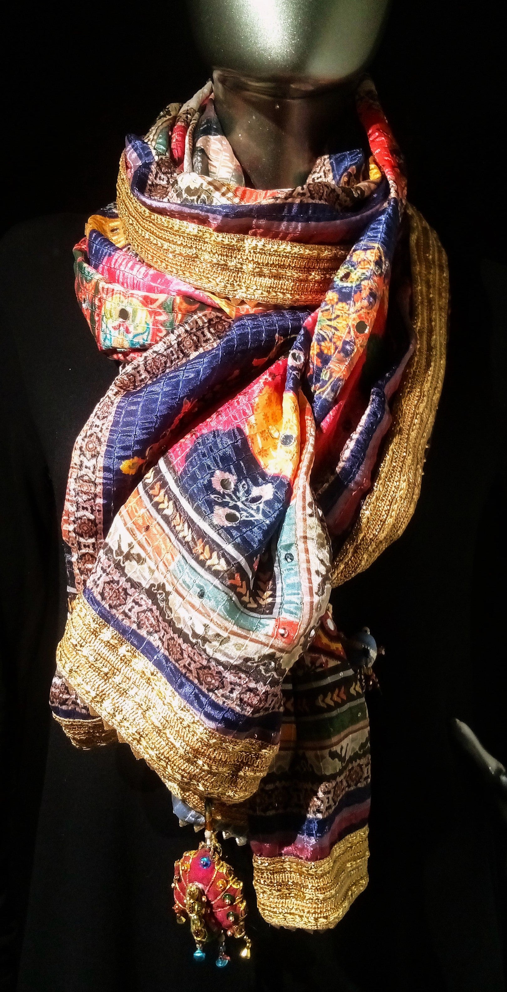 Composition : Soie imprimée, surpiqûres en coton. Bordures en lurex et fil de métal. Décorations en sequins et/ou miroirs et/ou perles. Pompons et paon en coton et perles de verre.