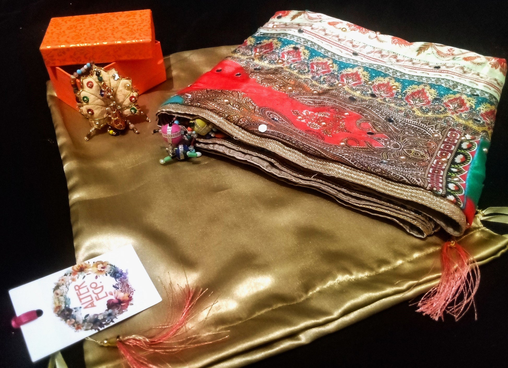 Composition : Soie imprimée. Bordures en lurex et fil de métal. Décorations en sequins et/ou miroirs et/ou perles. Pompons et paon en coton et perles de verre.