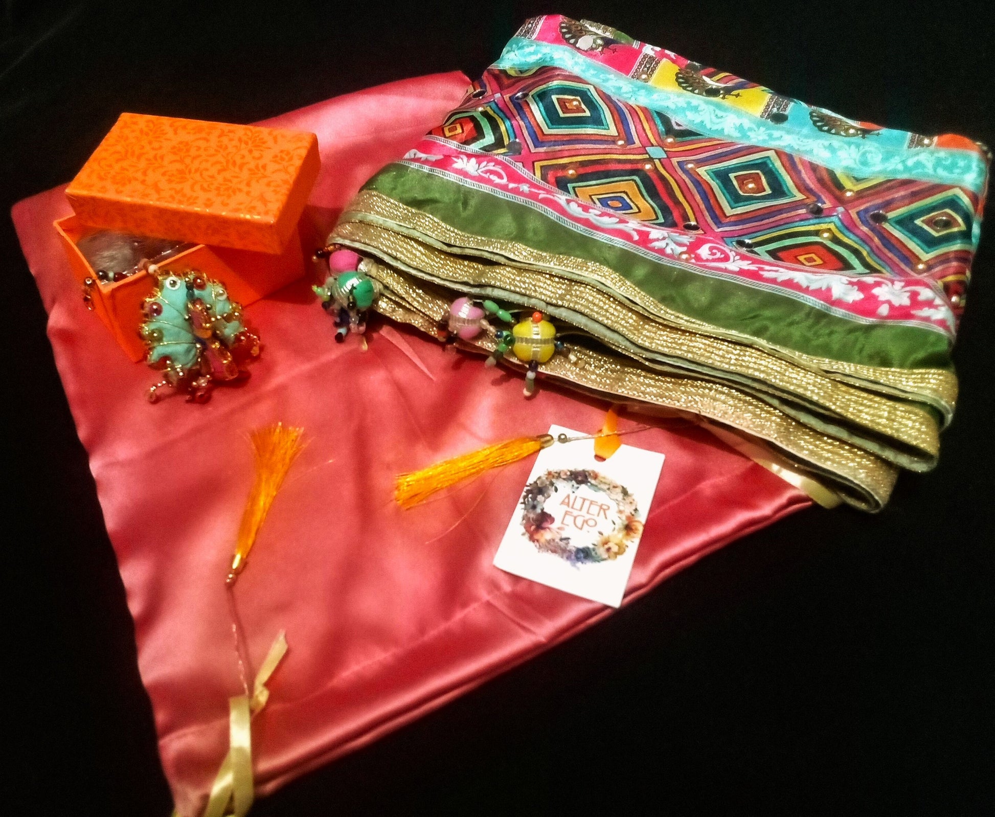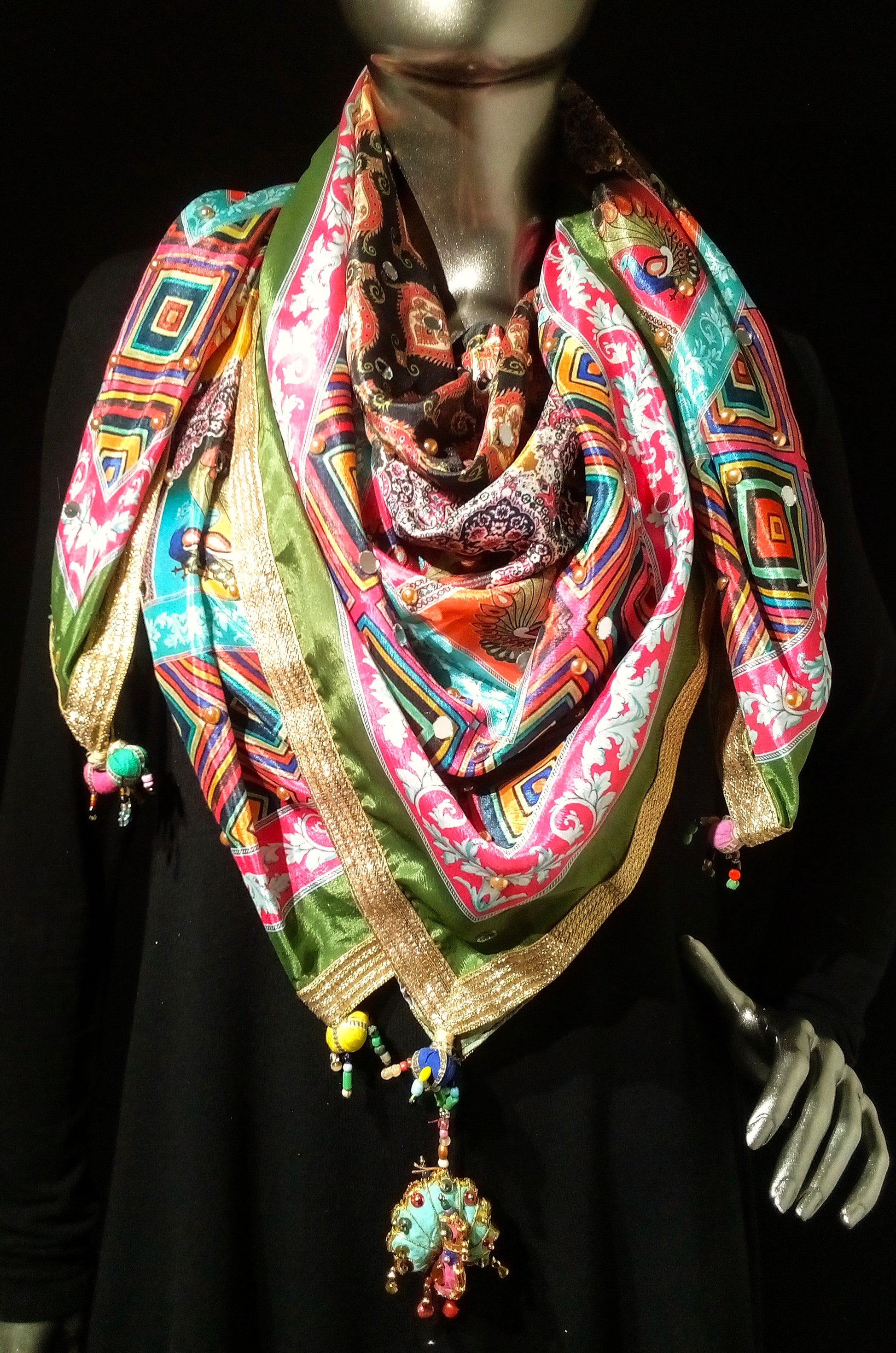 Composition : Soie imprimée. Bordures en lurex et fil de métal. Décorations en sequins et/ou miroirs et/ou perles. Pompons et paon en coton et perles de verre.