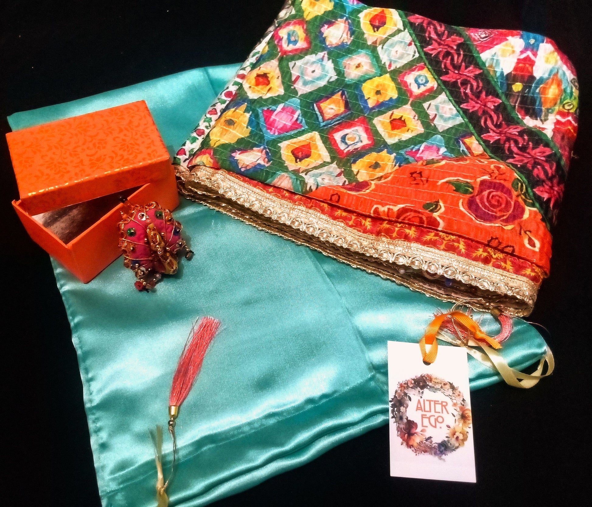 Composition : Soie imprimée, surpiqûres en coton. Bordures en lurex et fil de métal. Décorations en sequins et/ou miroirs et/ou perles. Pompons et paon en coton et perles de verre.