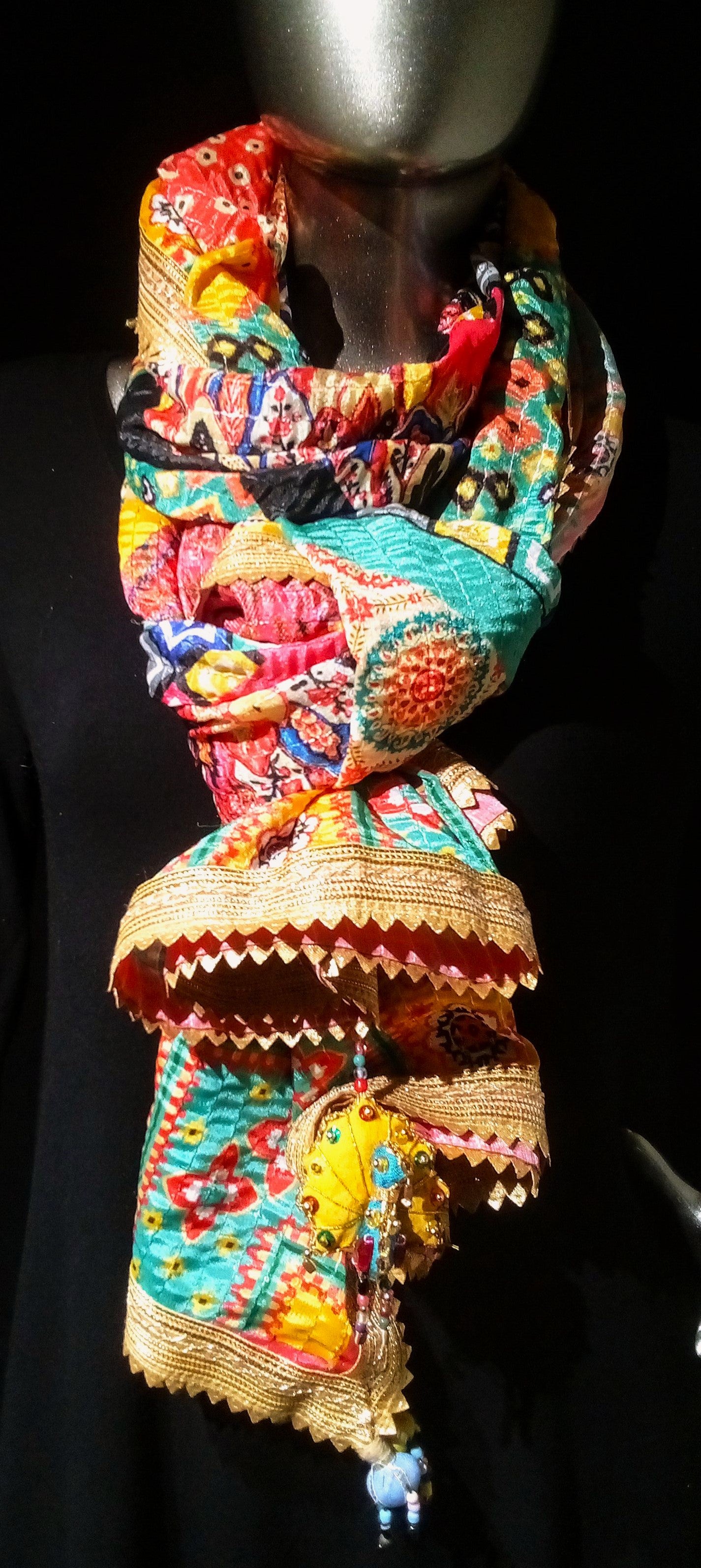 Composition : Soie imprimée, surpiqûres en coton. Bordures en lurex et fil de métal. Décorations en sequins et/ou miroirs et/ou perles. Pompons et paon en coton et perles de verre.