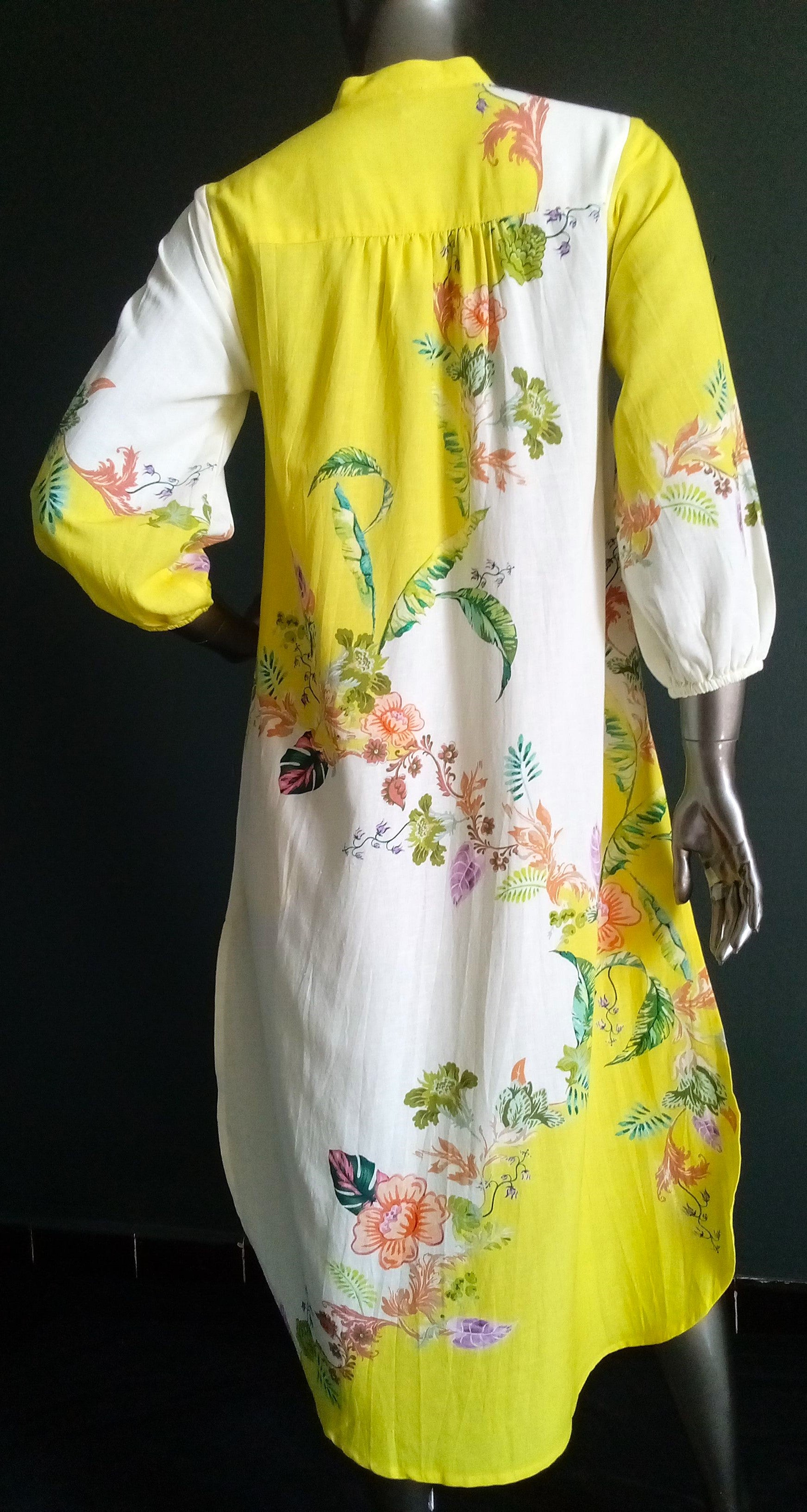 Robe-chemise impression digitale pour une grande qualité de détails .Manches ¾ .Col V officié boutonné. Longueur sous genoux. Coupe droite et légèrement cintrée. Fendue sur côtés. Poches.