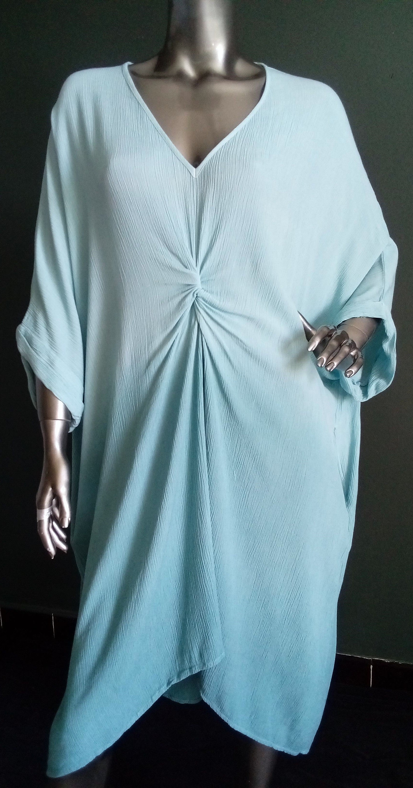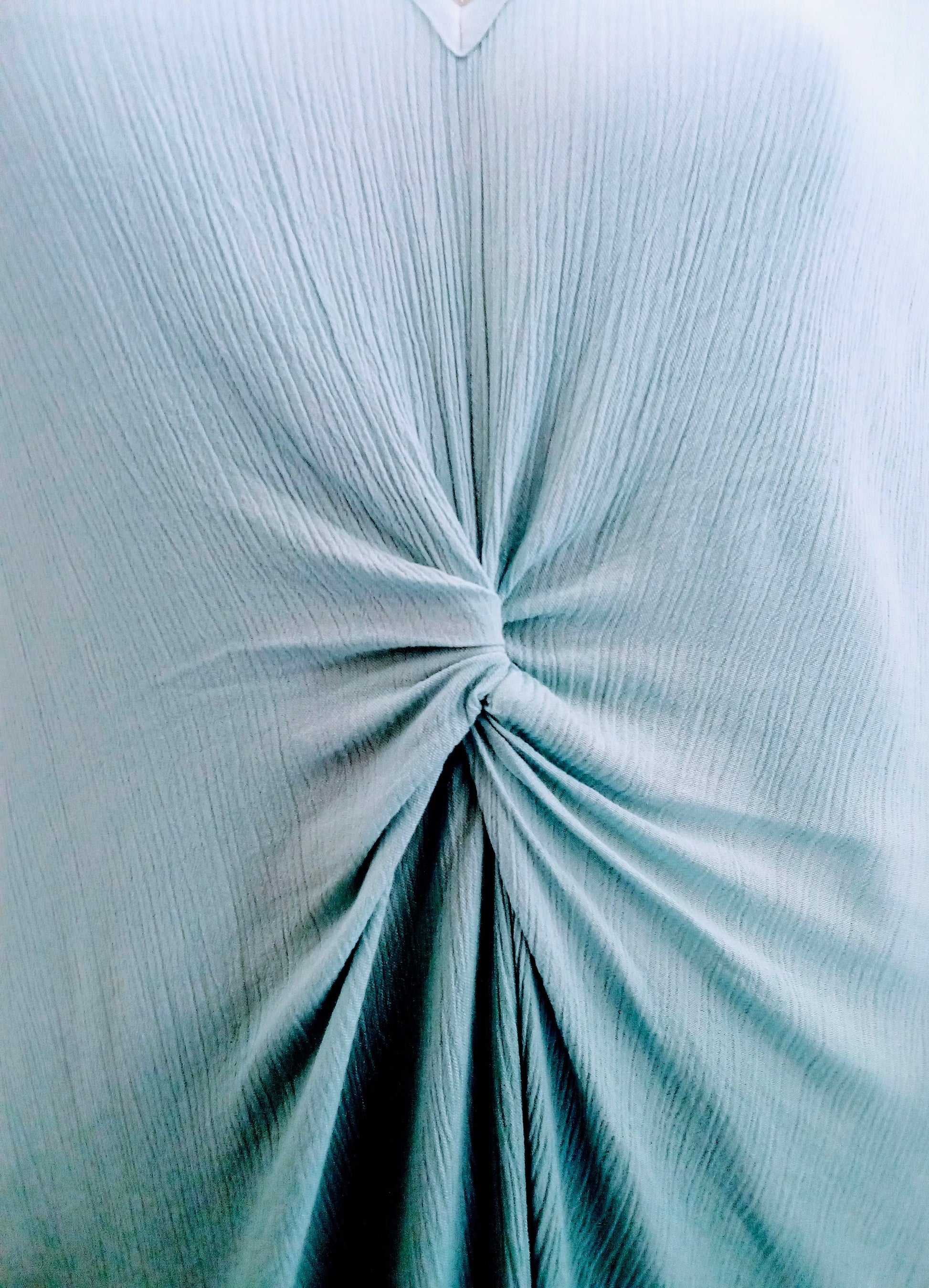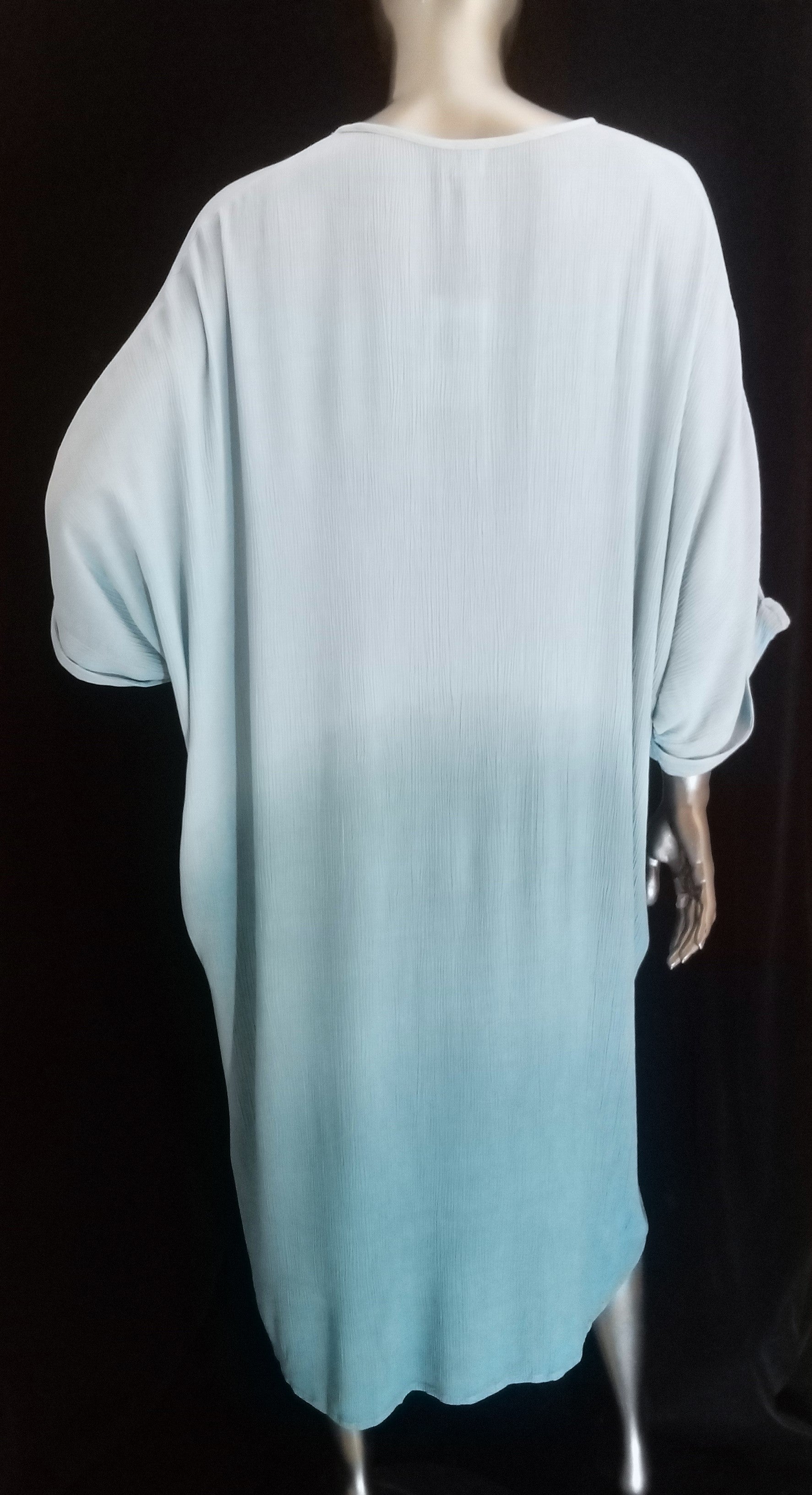 Robe à manches courtes, légèrement plissée. Poches côtés. Encolure en V. Nœud sous poitrine. Longueur sous genoux. Coupe fluide, souple et large. Dégradé de couleur partant du bleu très clair au bleu foncé. Tous les dégradés ont été réalisés de façon manuelle et artisanale ce qui peut entraîner quelques différences de teintes entre modèles de même tonalité. Repassage vapeur. Lavage à froid séparément. Attention selon la lumière la robe peu paraître plus bleu ciel ou plus bleu gris, ceci est dû aux nombreux pigments contenus dans la teinture naturelle.