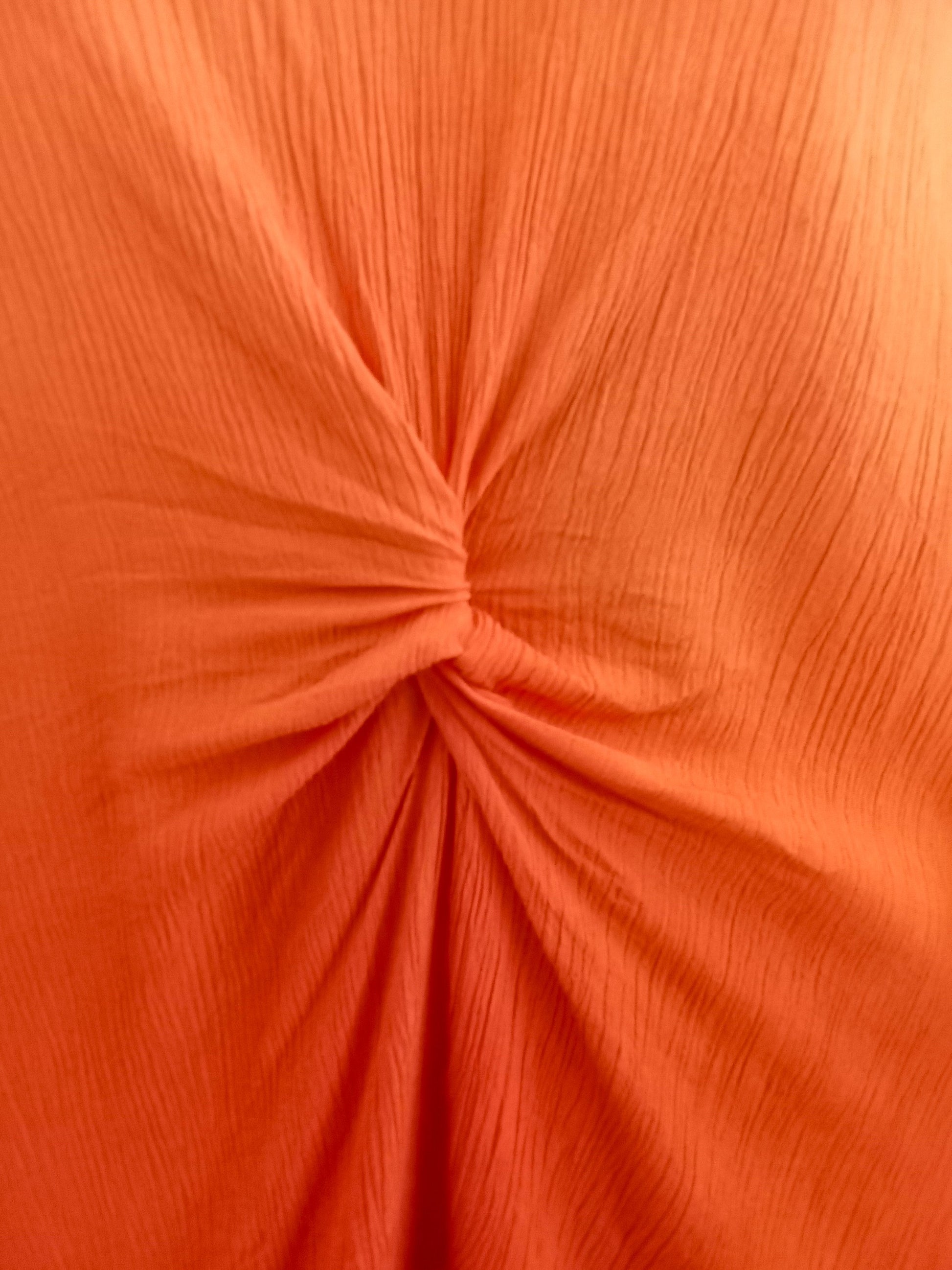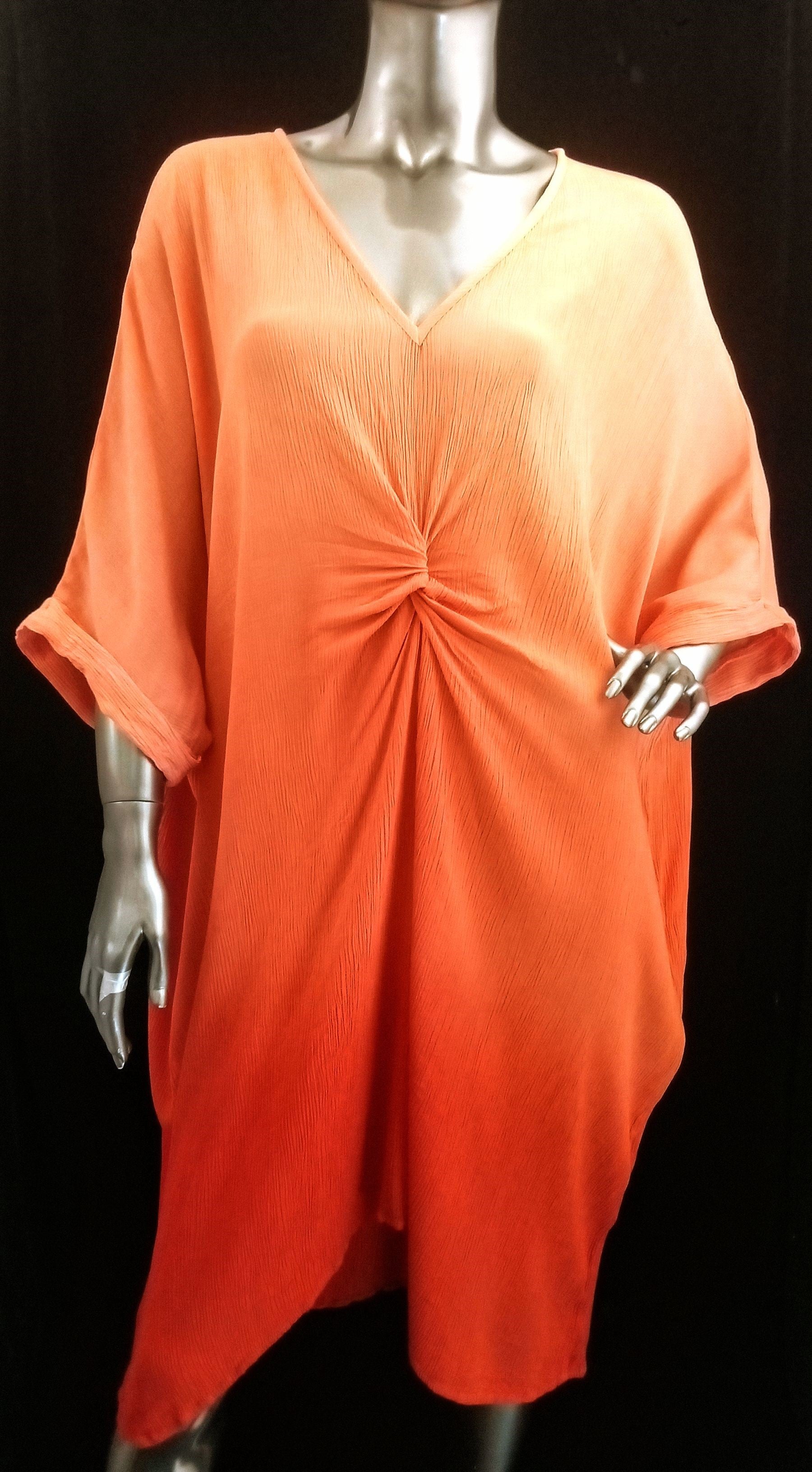 Robe à manches courtes, légèrement plissée. Poches côtés. Encolure en V. Nœud sous poitrine. Longueur sous genoux. Coupe fluide, souple et large. Dégradé de couleur partant de l'orange très clair l'orange foncé. Tous les dégradés ont été réalisés de façon manuelle et artisanale ce qui peut entraîner quelques différences de teintes entre modèles de même tonalité. Repassage vapeur. Lavage à froid séparément. Attention selon la lumière la robe peu paraître plus orange ou plus rouge, ceci est dû aux nombreux pigments contenus dans la teinture naturelle.